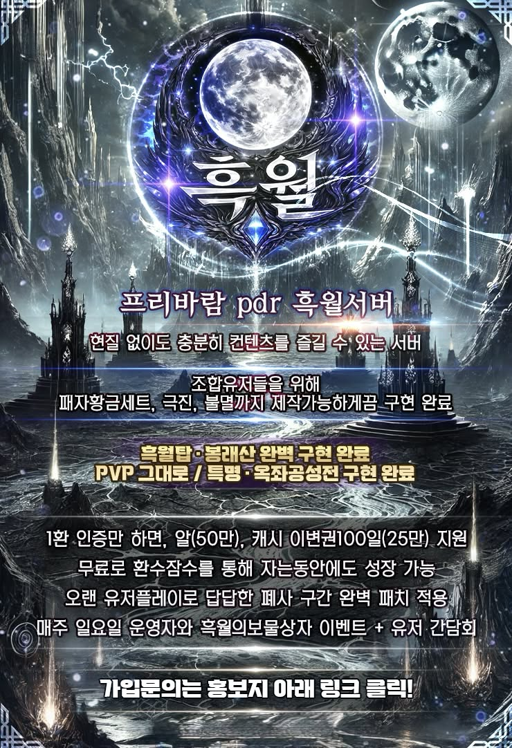 ✅PDR 흑월서버✅완벽한 유저와 소통과 유저친화적 서버✅확실한 뉴비지원이벤트✅단체이주보상OK✅✅ 흑월서버 1월 07일 GRAND OPEN✅ 유저와 소통하는 투명 운영 / 유저친화 최우선✅ 잦은 섭팅 NO · 잦은 리붓 NO (안정 지향)✅ 7.34 PDR · 반하자 지향 · 깔끔한 인터페이스 / 최고 구현율 지향✅ 단체이주보상 OK✅ 흑월서버 핵심 컨텐츠✅ 흑룡레이드 / 다이쇼군 일일 레이드 완벽 구현 (보상 넉넉)✅ 흑월탑 · 봉래산 완벽 구현 완료✅ PVP 그대로 / 특명 · 옥좌공성전 구현 완료✅ 공성전 · 남북대전: 한방 싸움이 아닌 전략 & 팀워크형 전투✅ 조합유저들을 위해 패자황금세트, 극진, 불멸까지 제작가능하게끔 구현 완료✅ 밸런스 & 성장✅ 5가지 직업 밸런스 안정화 (각 직업 특색 살림)✅ 오랜 유저플레이로 답답한 폐사 구간 완벽 패치 적용✅ 초반 진입장벽 확 낮춘 뉴비 개선 패치 완료✅ 궁사 직업 추가 (완벽한 밸런스 지향)✅시스템 & 편의✅ 불멸마법 보유중✅ 수천벌 캐시옷 + 천연염색 무제한 가능✅ 불멸 용무기 제작 + 무기 각인 시스템 구현 완료✅ 현질 없이도 충분히 컨텐츠를 즐길 수 있는 서버✅ 부캐 멀티 혜택으로 인게임 재화 대폭 상향 + 차별화된 혜택✅이벤트✅ 1환인증만하면, 알(50만), 캐시이변권100일(25만) 지원무료로 환수잠수를 통해 자는동안에도 성장 가능100일동안 캐시이변권을 통해 캐릭터 마음대로 꾸미기 가능두루마리만 다깨도 쇄자+1세트, 각성일본무기류 구매가능장비대여권 2주 지급으로 초반성장 빠르게 가능✅ 상시 이벤트 진행: 경마 / 폭탄피하기 / 킹덤그라운드 외 다수✅ 매주 일요일 운영자와 흑월의보물상자 이벤트 + 유저 간담회✅ 키워놓은 것을 그대로! 서버 초기화해도 먹튀 절대 X✅ 디스코드: https://discord.gg/GBnqx4z22Q